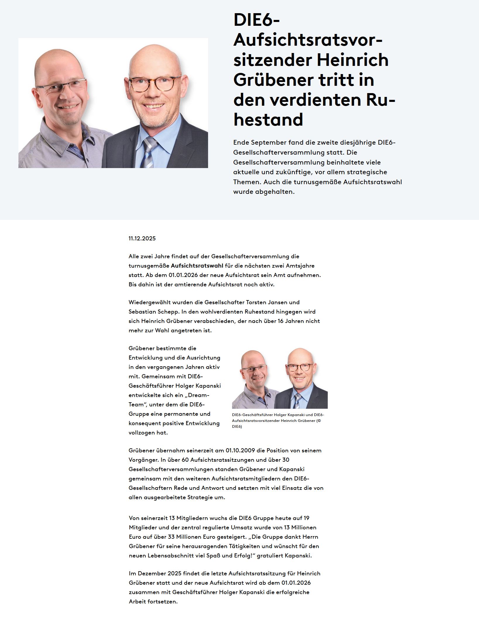 DIE6-Aufsichtsratsvorsitzender Heinrich Grübener tritt in den verdienten Ruhestand