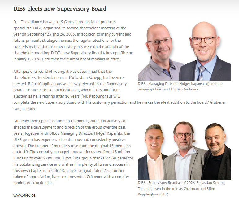 Im DIE6-Pressearchiv finden Sie zahlreiche Artikel und Informationen vom und über das Profi-Netzwerk der Werbeartikel-Unternehmer.